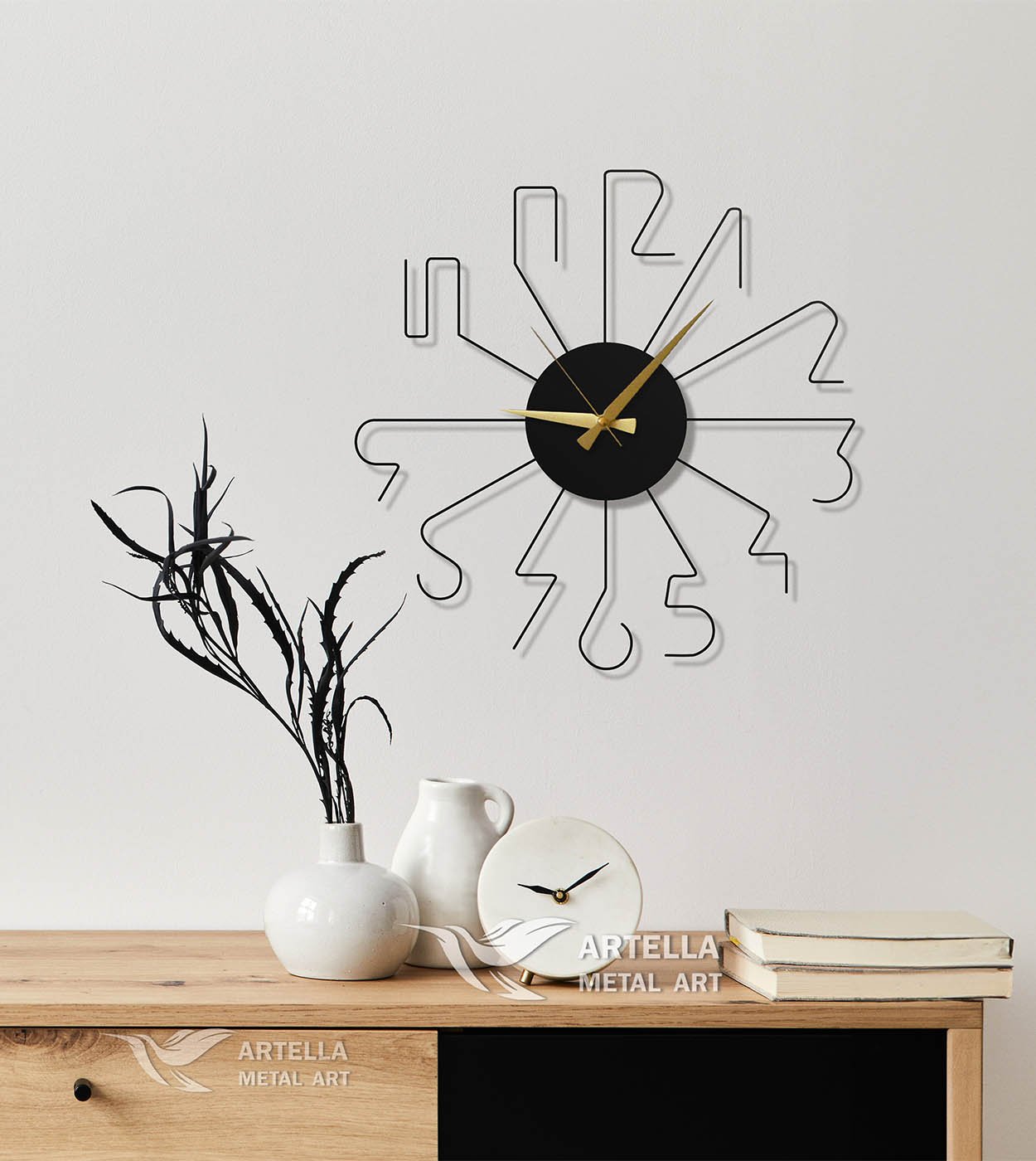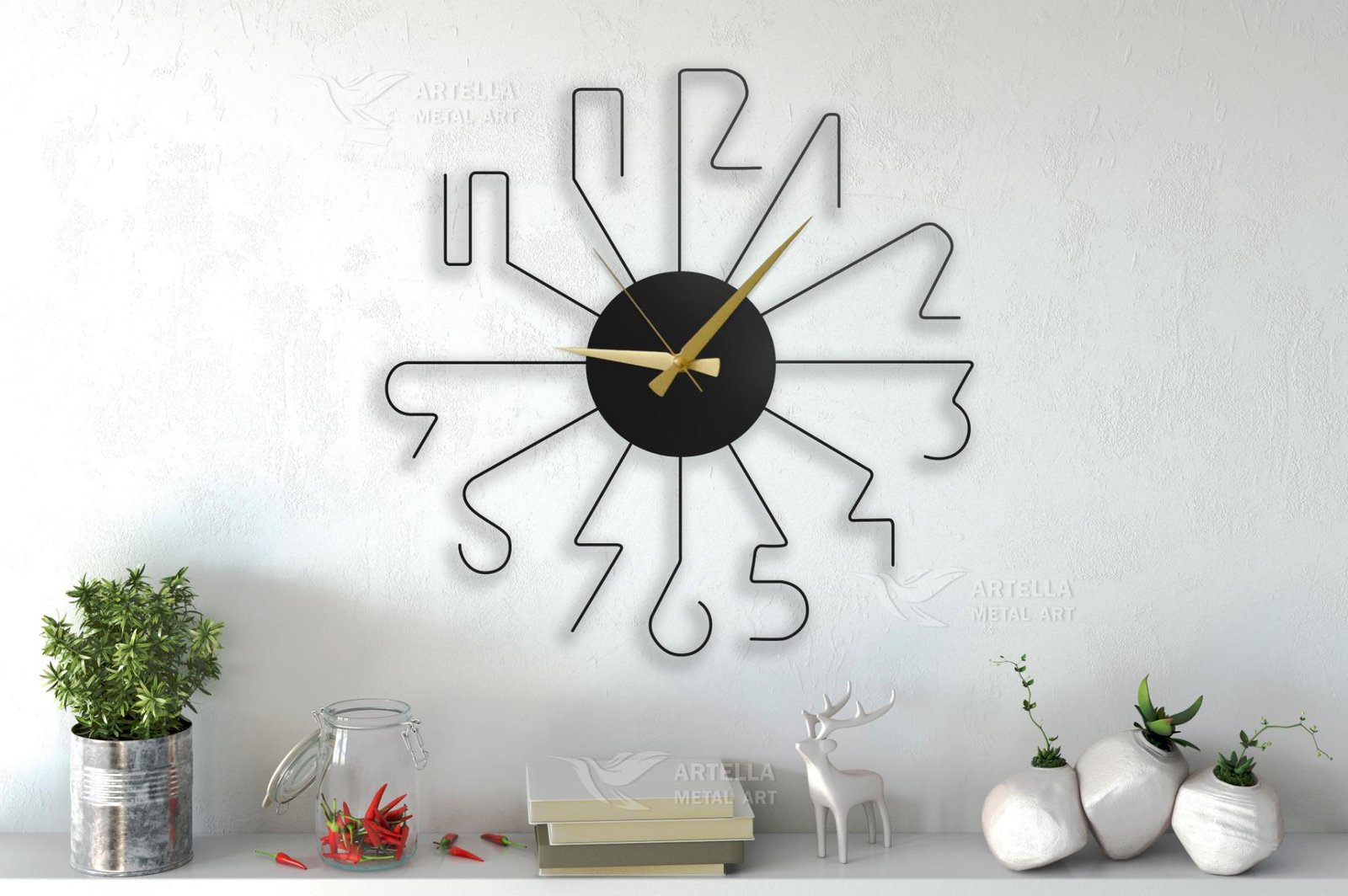 Ez az óra kiváló minőségű fémből készült, különös figyelmet fordítva a részletekre. Úgy készült, hogy tartós legyen és időtlen hatást keltsen otthonában vagy irodájában. Egyedi dizájn azoknak, akik valami különlegesre vágynak.